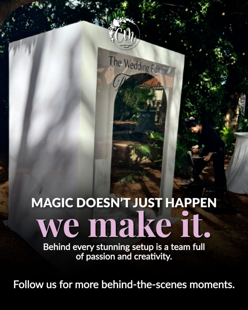As shown in the behind-the-scenes moment in the photo, these setups don’t just appear — they are built with intention, expertise, and artistic vision. Our team carefully designs, installs, and perfects every detail to create a premium wedding activation that guests fall in love with. From outdoor garden weddings to boutique venues across the South Florida region, this Box Magazine brings a sophisticated and editorial touch to every event.